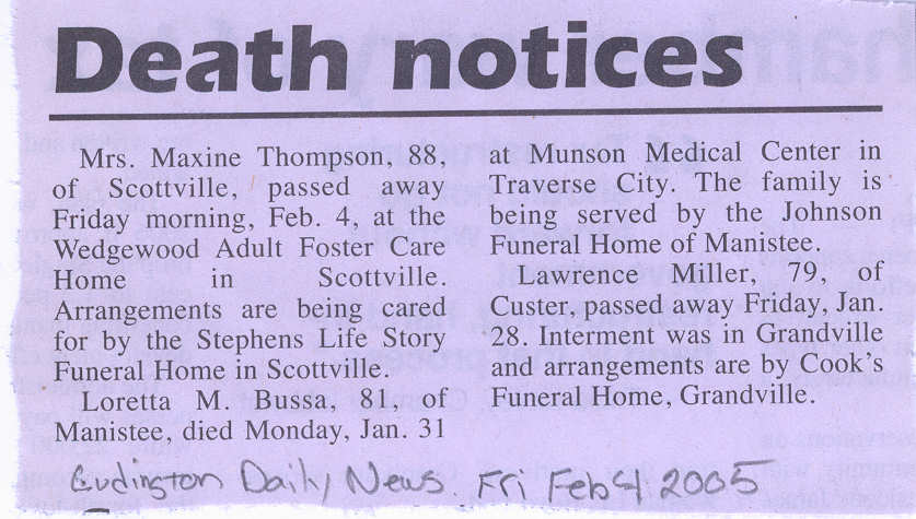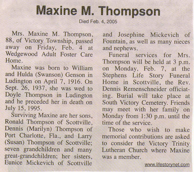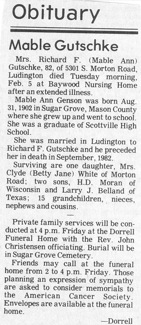 Mabel Genson's obituary. Mable is first cousin of my grandmother Eunice May Genson. |