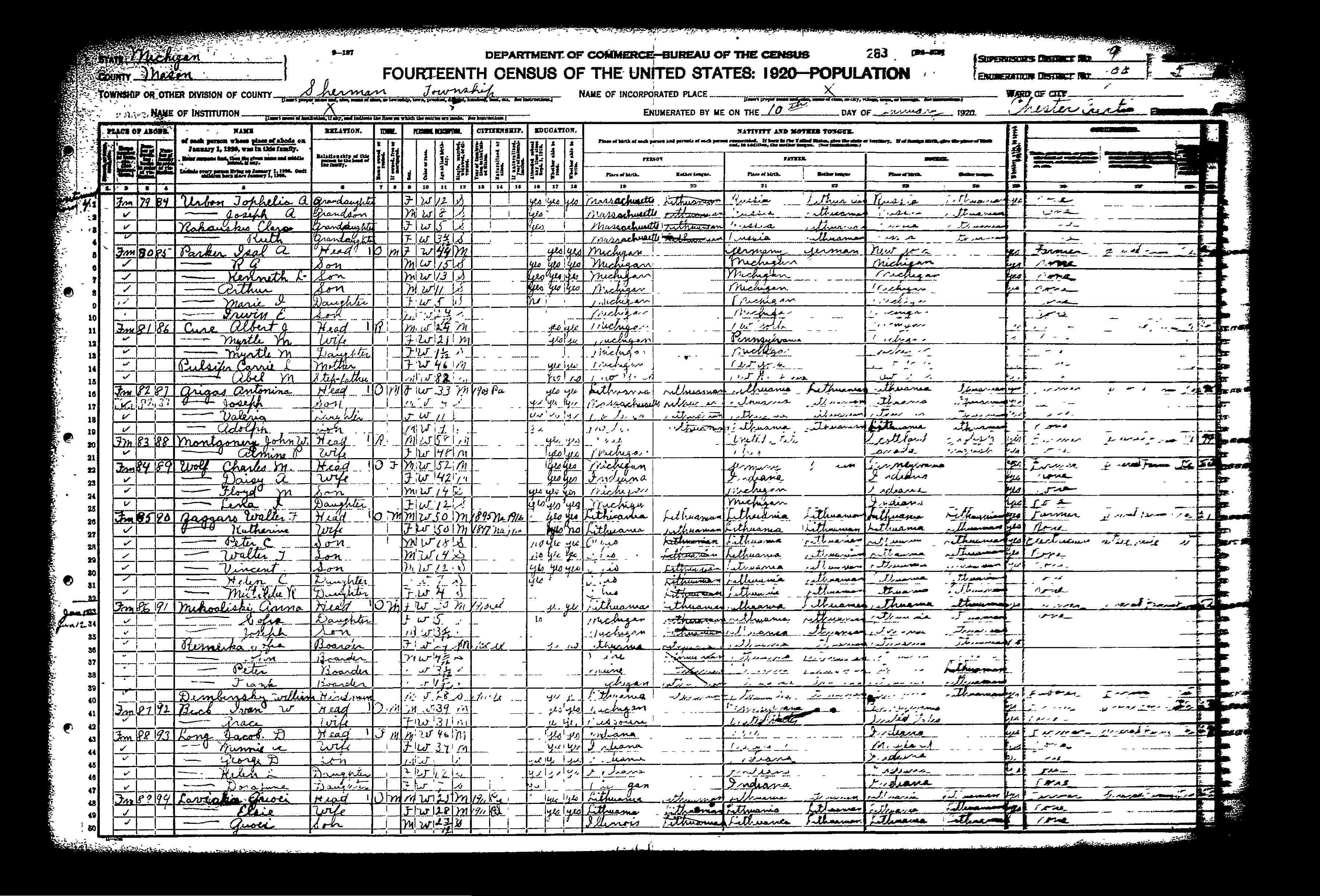 Mikolusky 1920 census - Sherman township, Michigan.