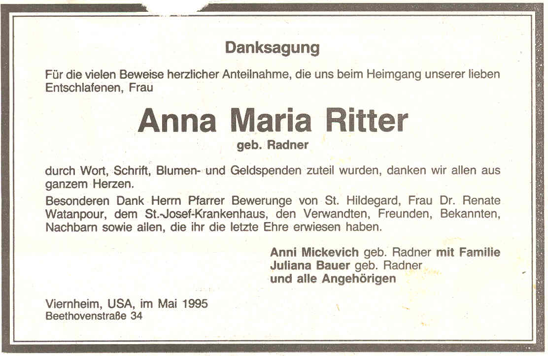 Anna Maria Radner "thank you" notice in paper after funeral. |