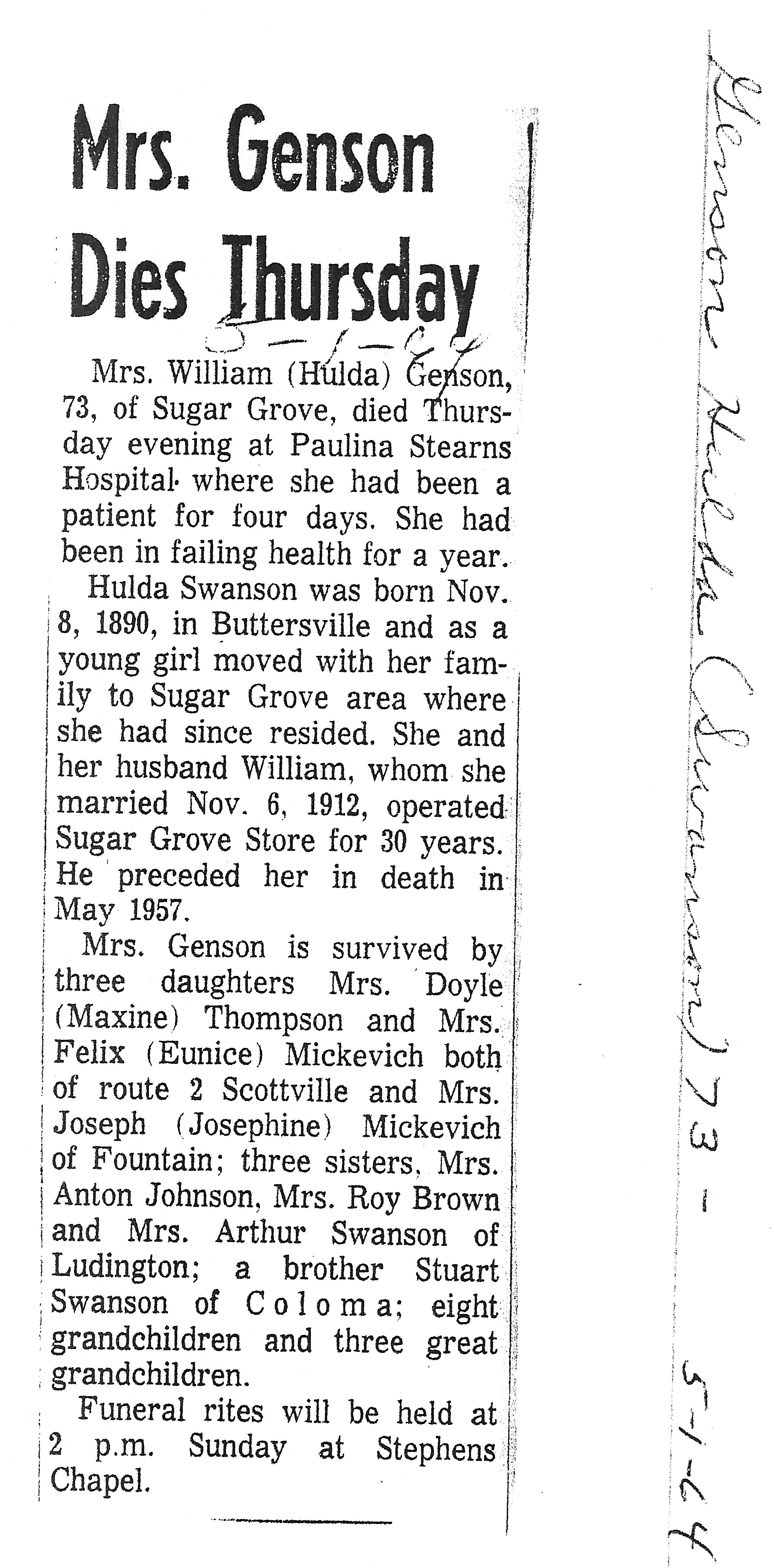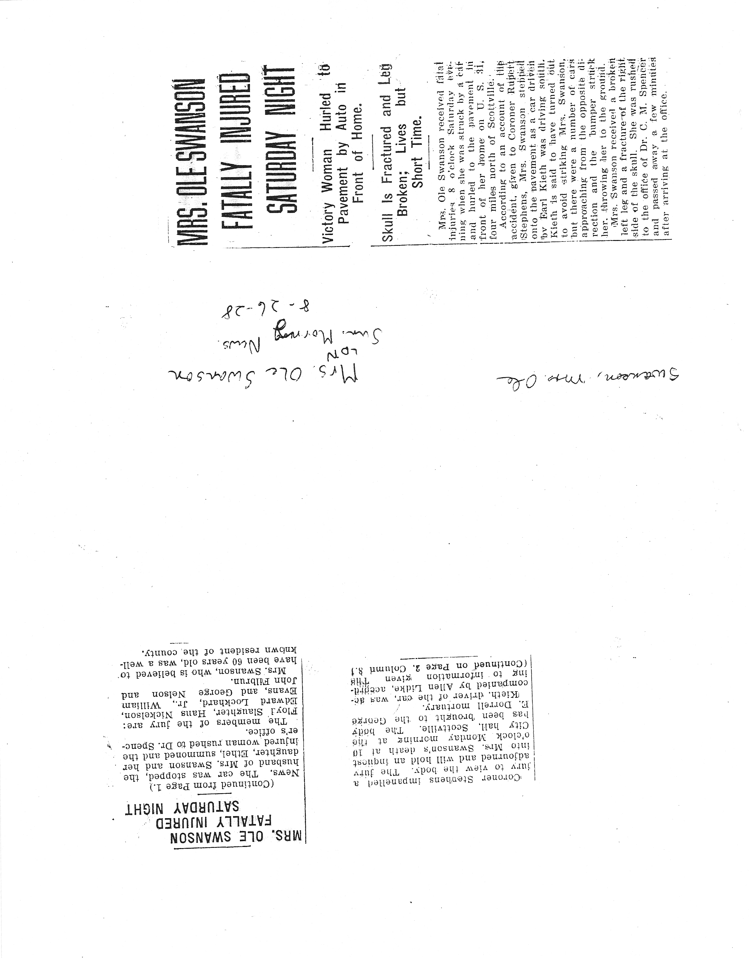 Christine Swanson fatal accident newspaper article from Ludington Daily News 8/26/1928