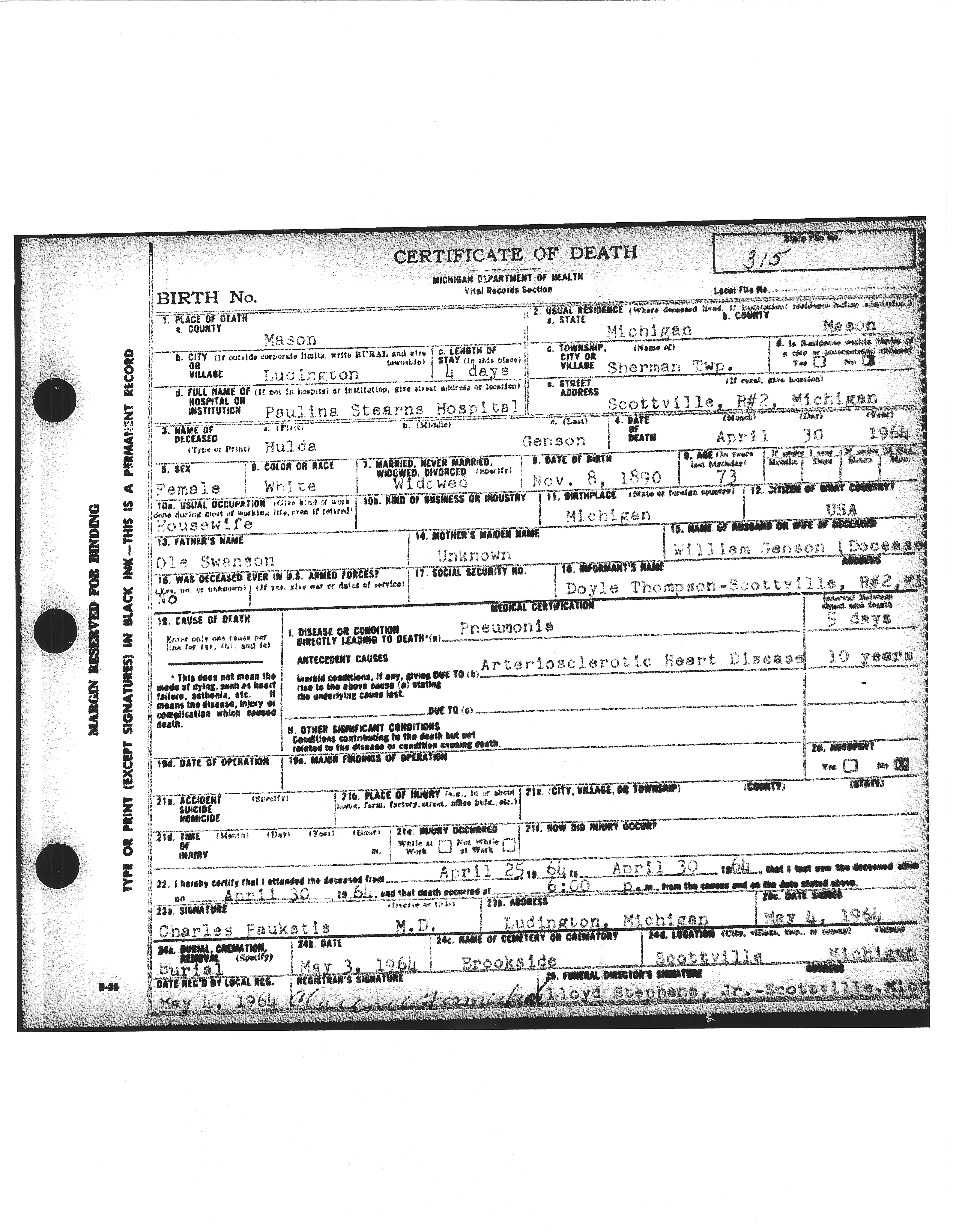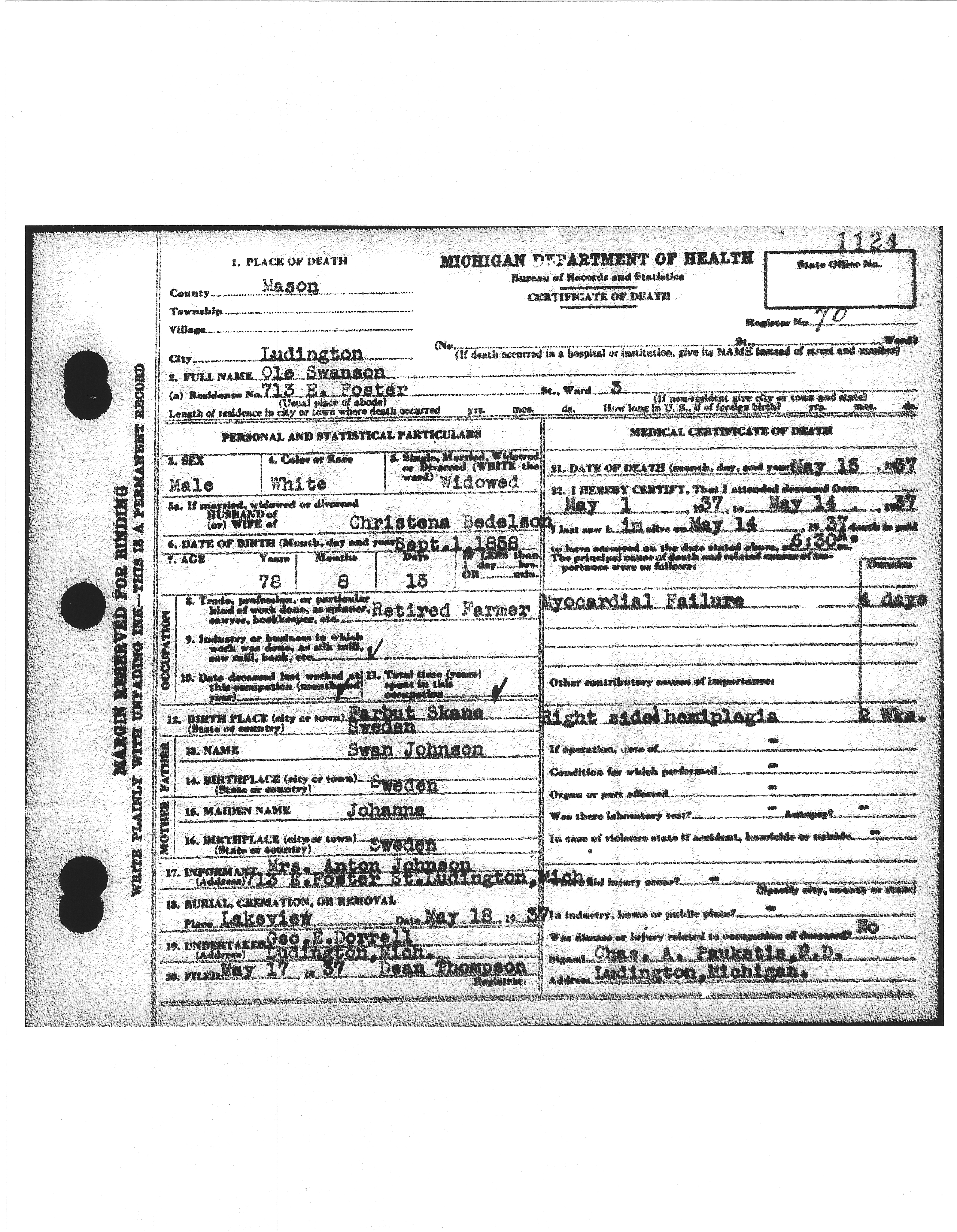 Ole Swanson tombstone, Lakeview cemetery, Ludington, Michigan |